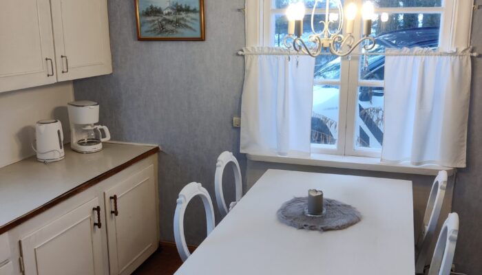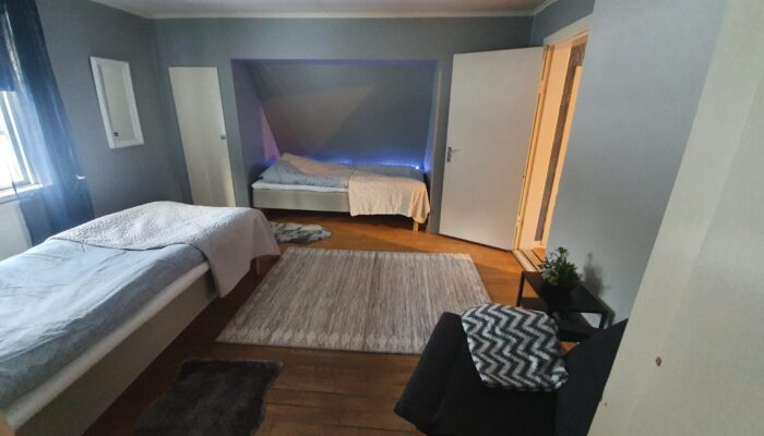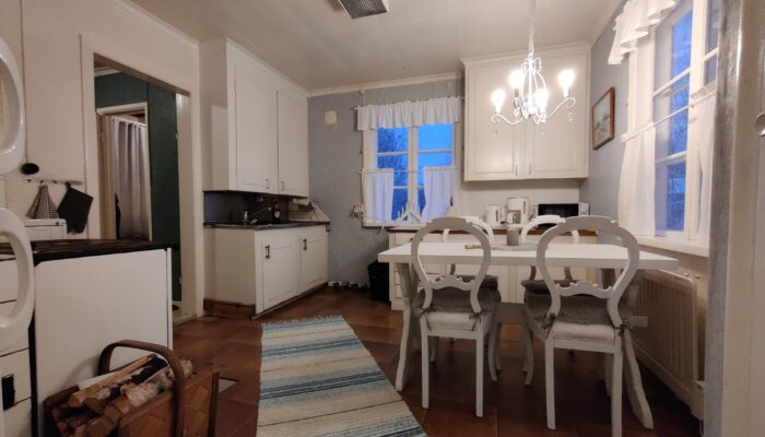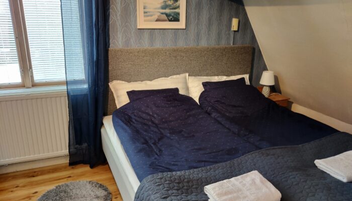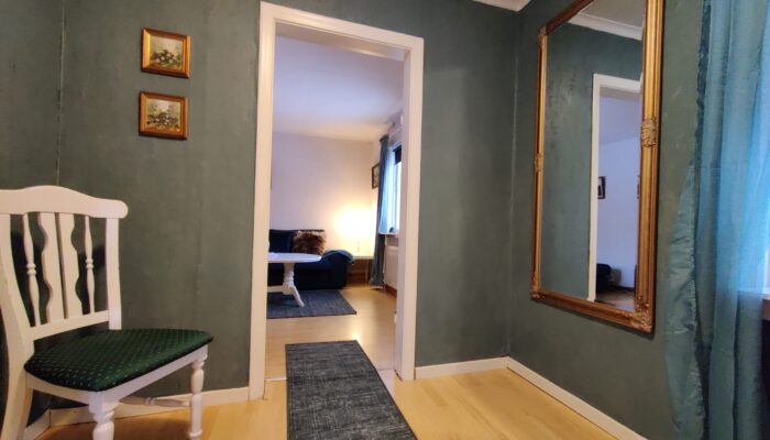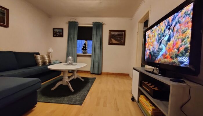 På nedervåningen finns hall, vardagsrum med stor soffa och TV, badrum med toalett och dusch, ett litet rum med arbetsyta samt ett kök utrustat för självhushåll. På övervåningen finns ett sovrum med dubbelsäng och ett sovrum med två sängar, samt toalett. Plats att ställa upp resesäng till litet barn finns. Sängarna är bäddade när ni anländer och handdukar finns i badrumsskåpet nere.